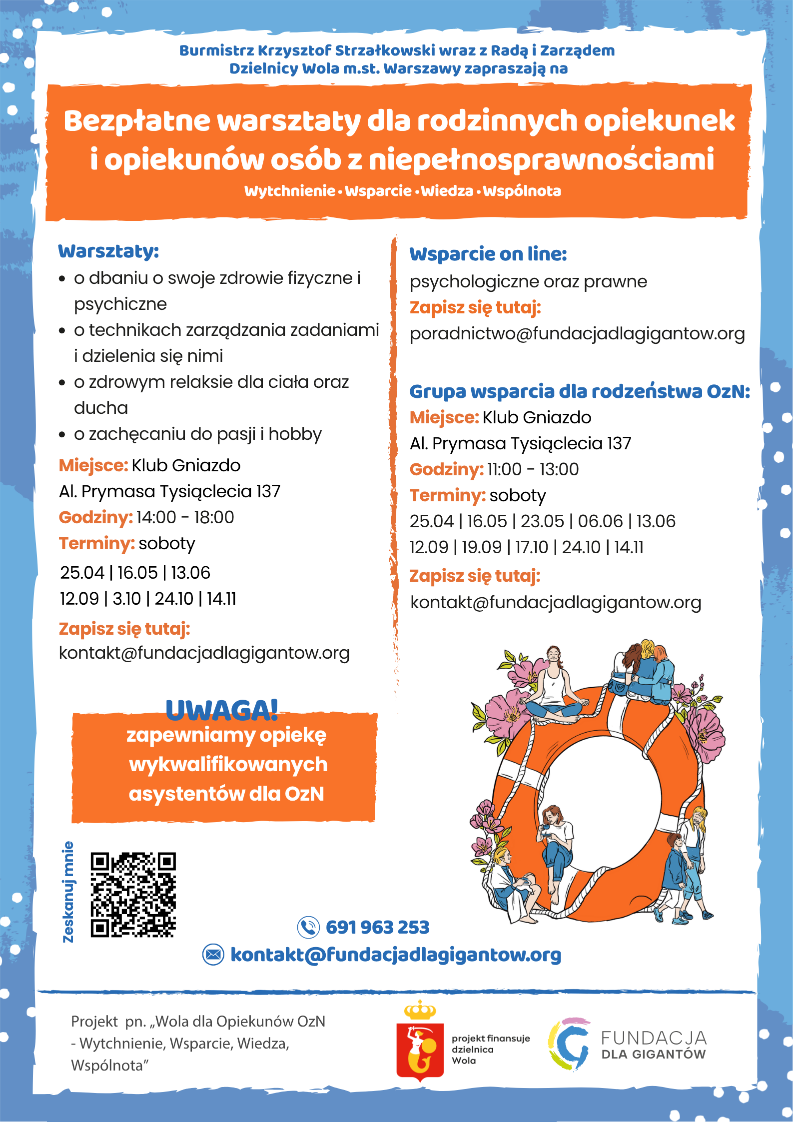 25 kwietnia 2026 r. odbędzie się 1 warsztat w ramach trzeciej edycji projektu pt. „Wola dla Opiekunów OzN – Wytchnienie, Wsparcie, Wiedza, Wspólnota”, skierowanego do opiekunów-rodziców osób z niepełnosprawnościami szczególnie z autyzmem z dzielnicy Wola i organizowanego we współpracy z Dzielnicą Wola m.st Warszawy.