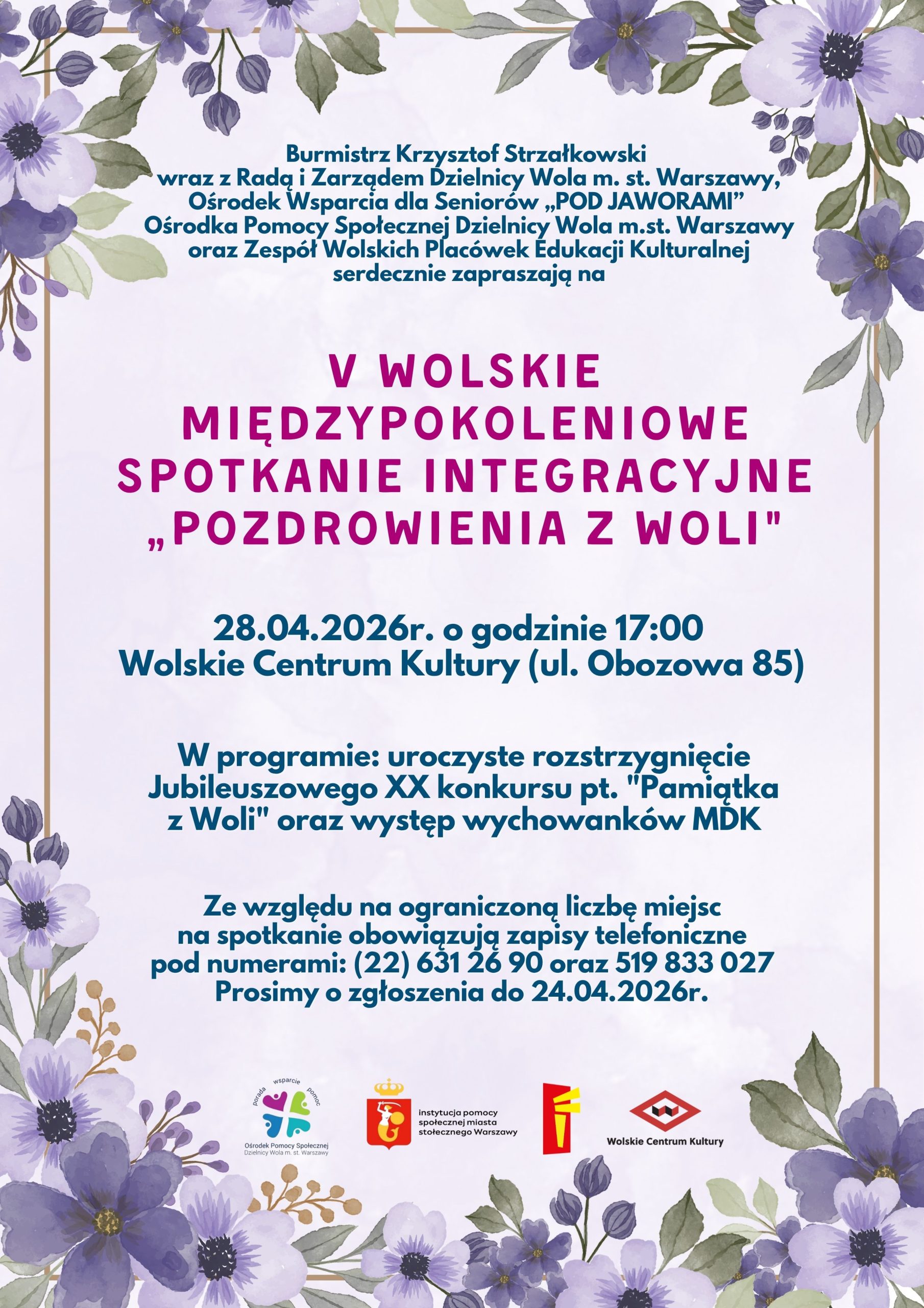 Burmistrz Krzysztof Strzałkowski wraz z Radą i Zarządem Dzielnicy Wola m.st. Warszawy, Ośrodek Wsparcia dla Seniorów „Pod Jaworami” oraz Zespół Wolskich Placówek Edukacji Kulturalnej serdecznie zapraszają na V Międzypokoleniowe spotkanie integracyjne „Pozdrowienia z Woli”.