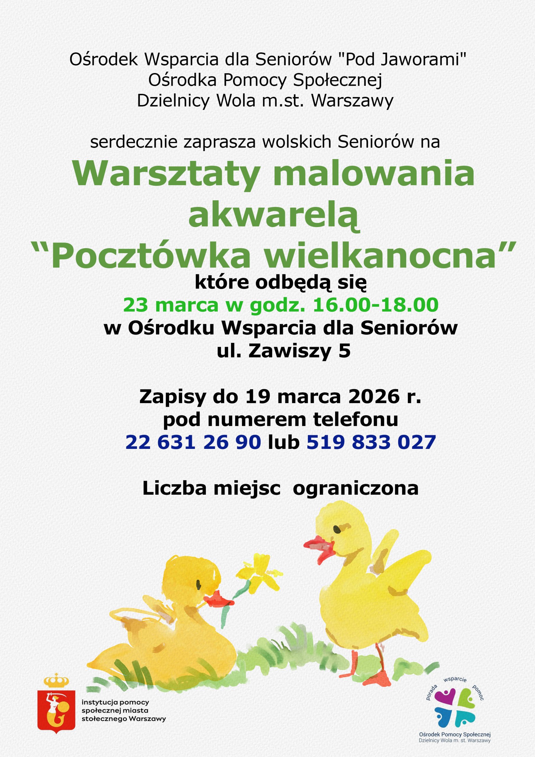 Ośrodek Wsparcia dla Seniorów “Pod Jaworami” Ośrodka Pomocy Społecznej Dzielnicy Wola m.st.Warszawy serdecznie zaprasza wolskich Seniorów na warsztaty malowania akwarelą “POCZTÓWKA WIELKANOCNA”