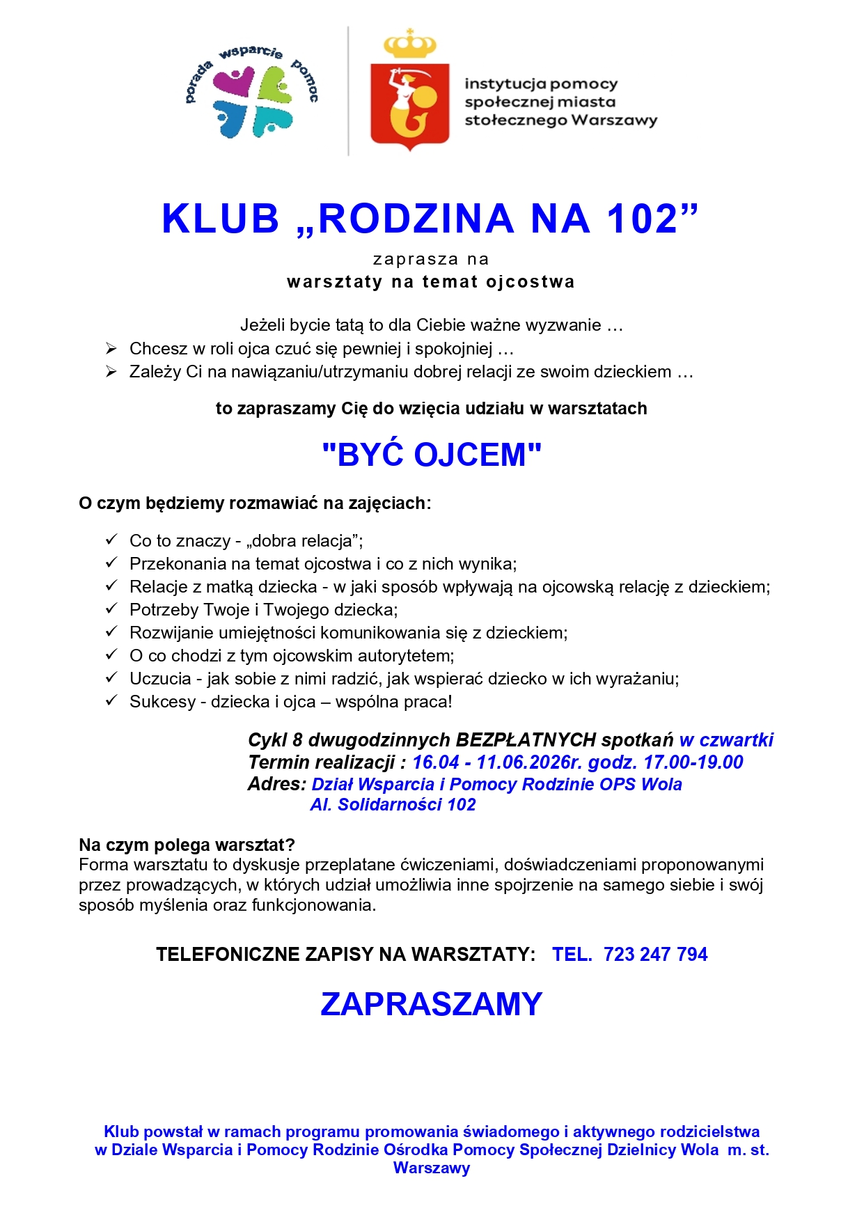 KLUB „RODZINA NA 102” zaprasza na warsztaty na temat ojcostwa